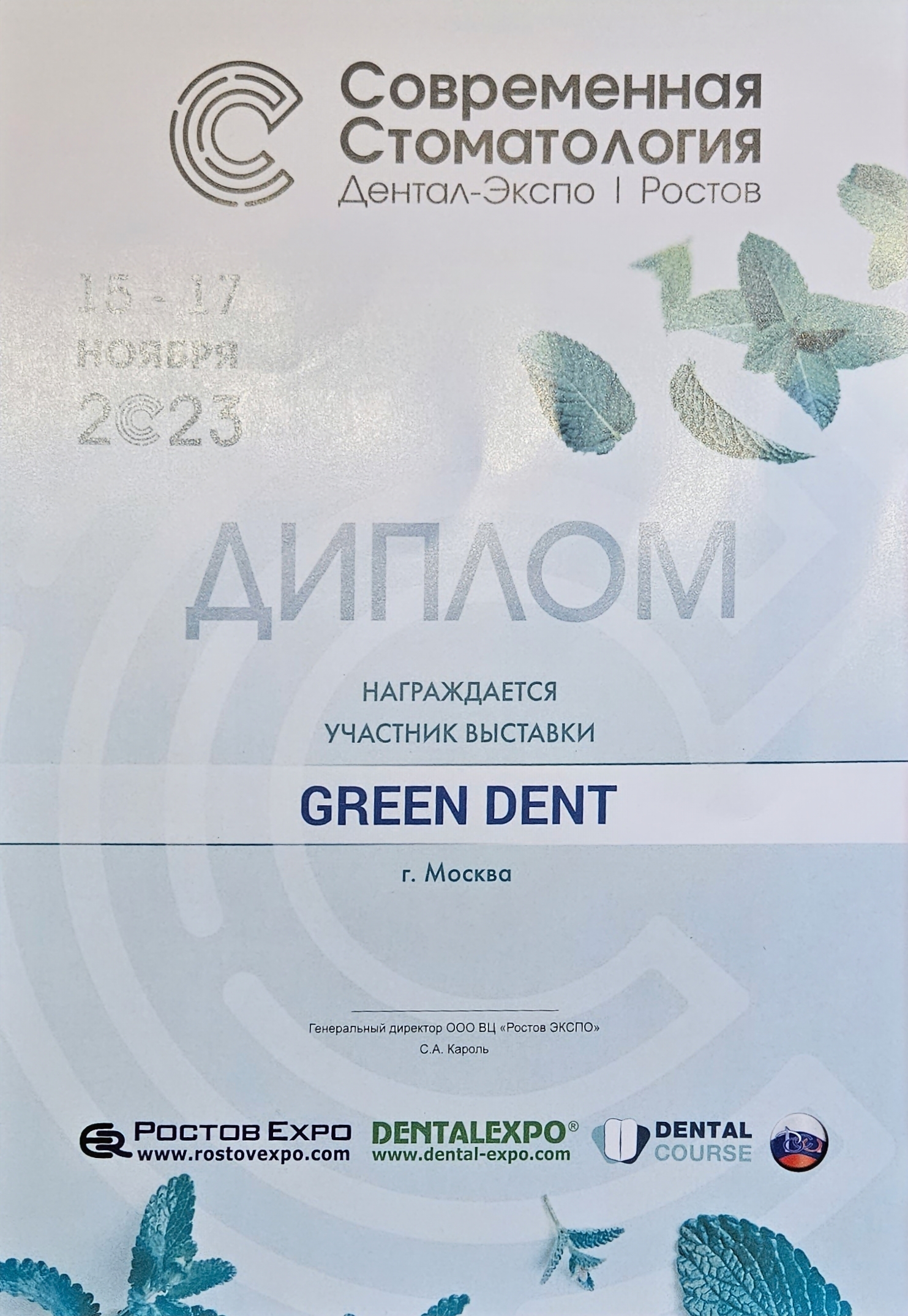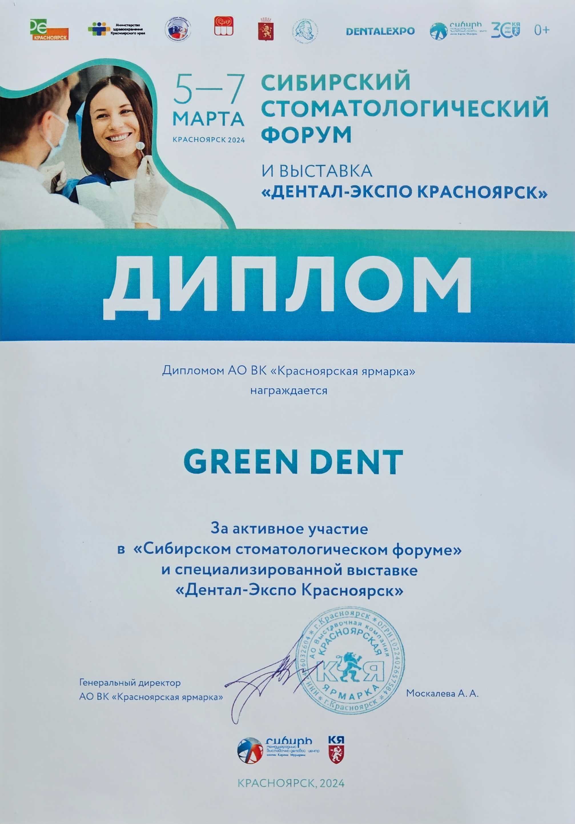 Диплом GREEN DENT за активное участие в «Сибирском стоматологическом форуме» и специализированной выставке «Дентал-Экспо Красноярск»